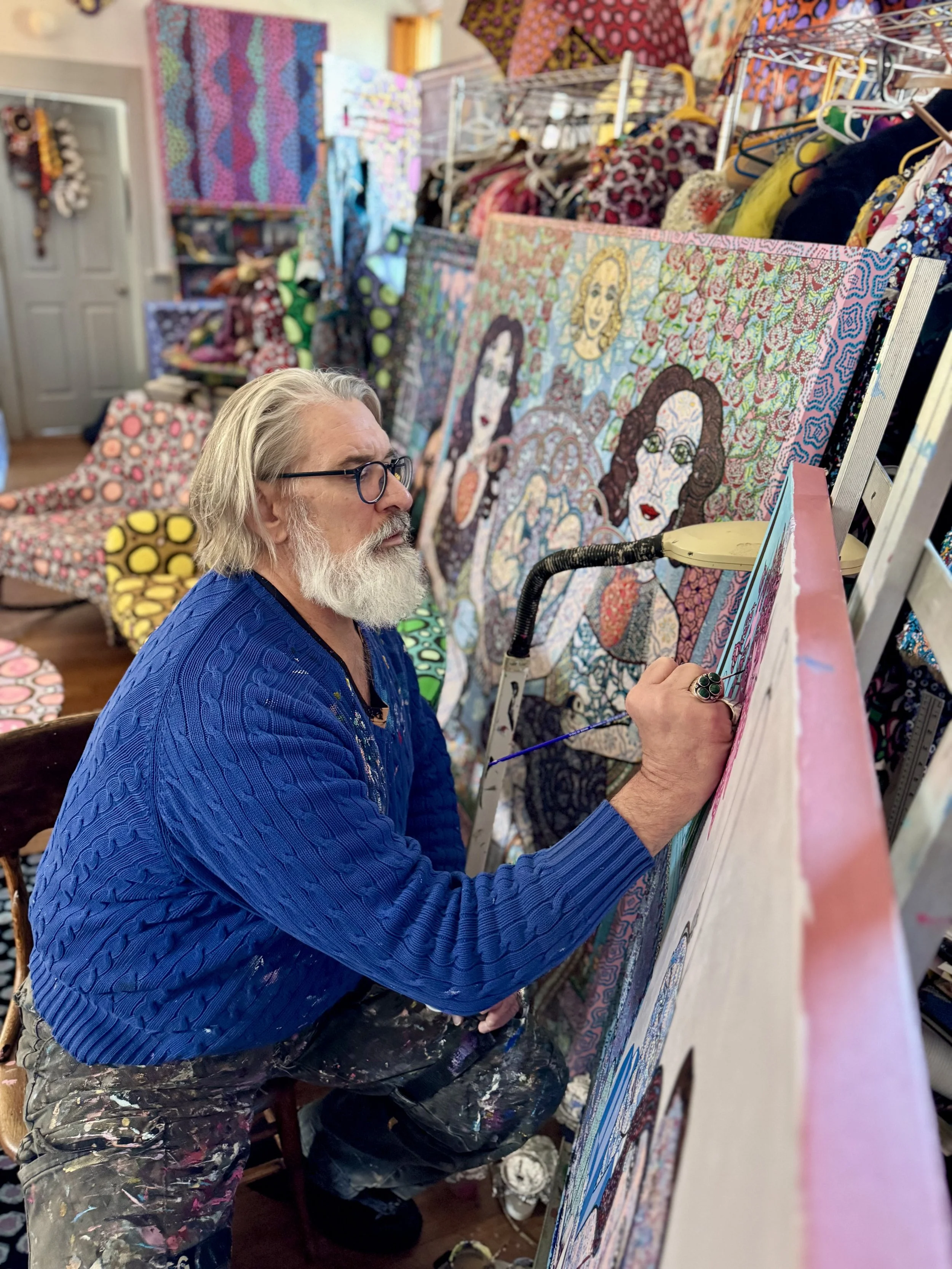 Lon Michels is a Neo-pop artist who portrays the human figure within boldly patterned compositions to explore deeper dimensions of identity and humanity. Challenging traditional notions of portraiture, he incorporates personal tokens and intricately meaningful patterns unique to each subject, adding emotional depth to his richly detailed paintings.