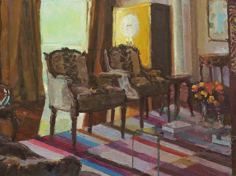 Wisconsin artist Paula Swaydan Grebel's paintings bring to life the visual experience of amazing interiors and a journey through carefully curated indoor worlds. Fascinated by the emotional response a space can elicit, Paula’s focus is on the initial moments of entering a space. Spaces infused with the flair of personal taste and history captures her sense with a sense of satisfaction. Her paintings flushed with color and finished with confident brushwork, demonstrate quiet moments of the everyday. She transports us to light-drenched rooms and intimate views of thoughtful still-life arrangements in her latest series of small oil paintings. Each painting is a testament to Swaydan Grebel's ability to capture the ephemeral, offering viewers a momentary glimpse into calm, domestic spaces.