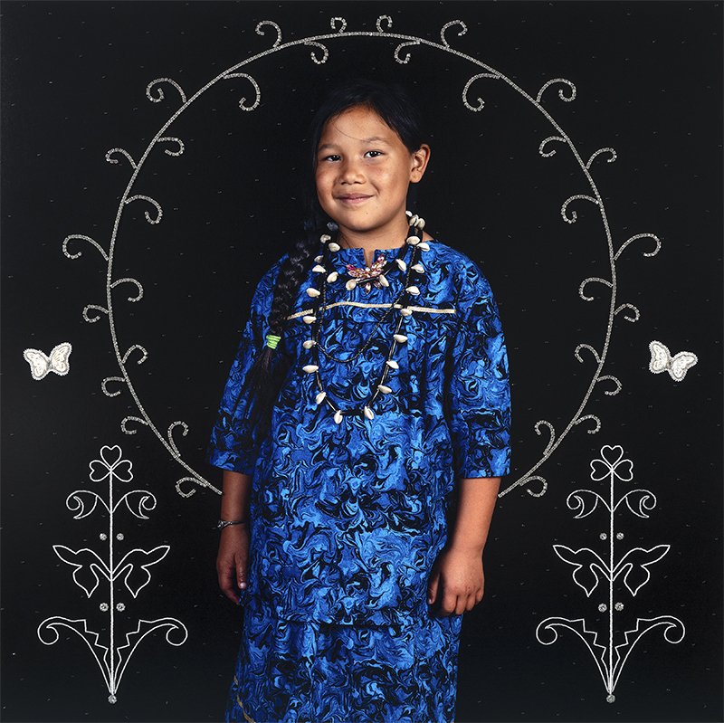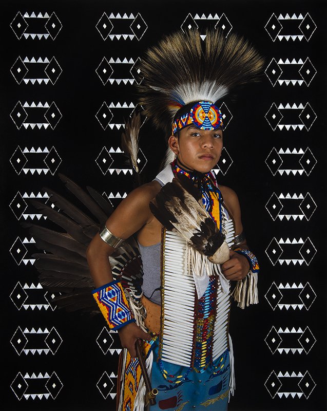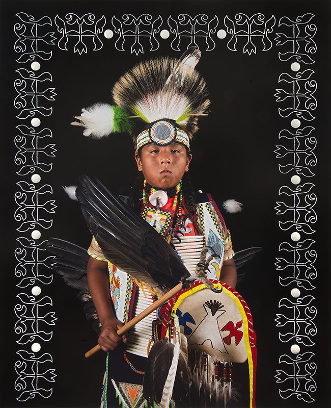 Tom Jones is a photographic artist whose work comrnents on the identity, experience, and perception of American Indian culture. He has visually incorporated this experience through beaded HoChunk floral designs directly onto the photograph, to give a symbolic representation of "our ancestors who are constantly watching over us and to present the pride, strength and beauty of my people."