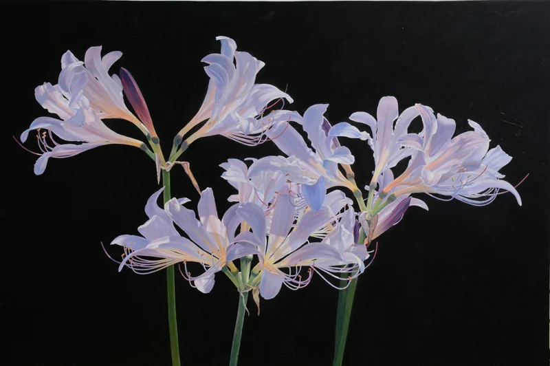 Many of the works in this exhibition feature Surprise Lilies, also known as Resurrection Flowers or Nek-kid Ladies, found blooming in late summer throughout his northern Illinois neighborhood. Photographed in daylight, Winn brings the flowering plants into extreme focus causing the background to virtually disappear. In the studio Winn replaces the non-descript background with complete darkness resulting in stunning effects of light and dimension.